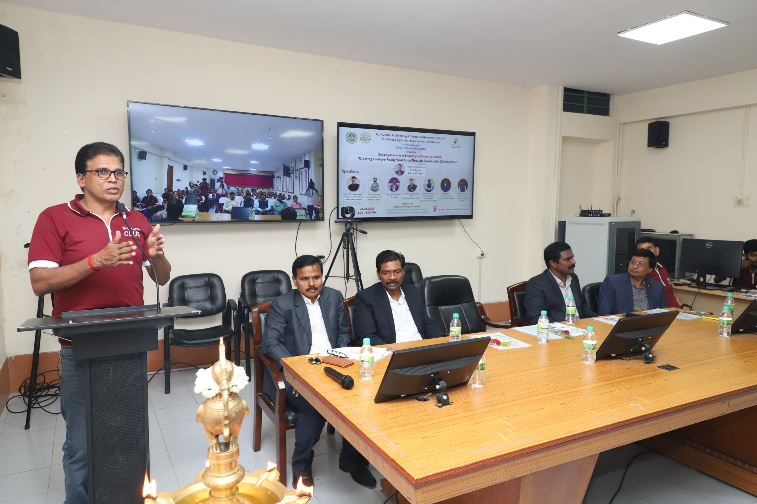 The event was inaugurated with the Presidential Address by Dr. A. Raviraj, Ph.D, Dean (Agricultural Engineering College and Research Institute, TNAU). His address set the tone for the event, highlighting the critical need for aligning academic programs with industry demands and ensuring that students are equipped with relevant skills for the evolving job market.